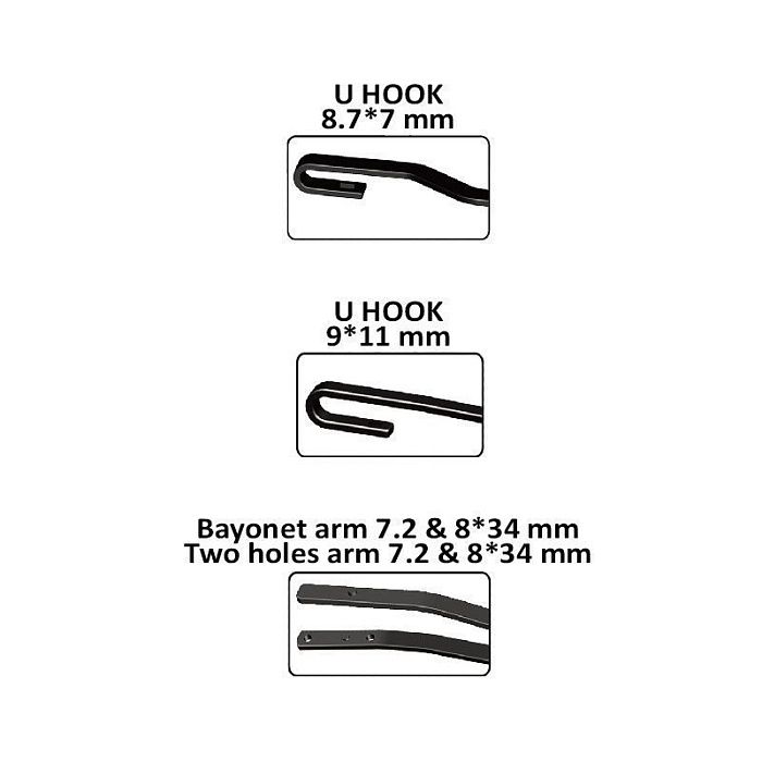 Совместимость с креплениями: U HOOK (8.7*7mm), U HOOK (9*11mm), Bayonet arm (7.2&8*34mm) Two holes arm (7.2&8*34mm)